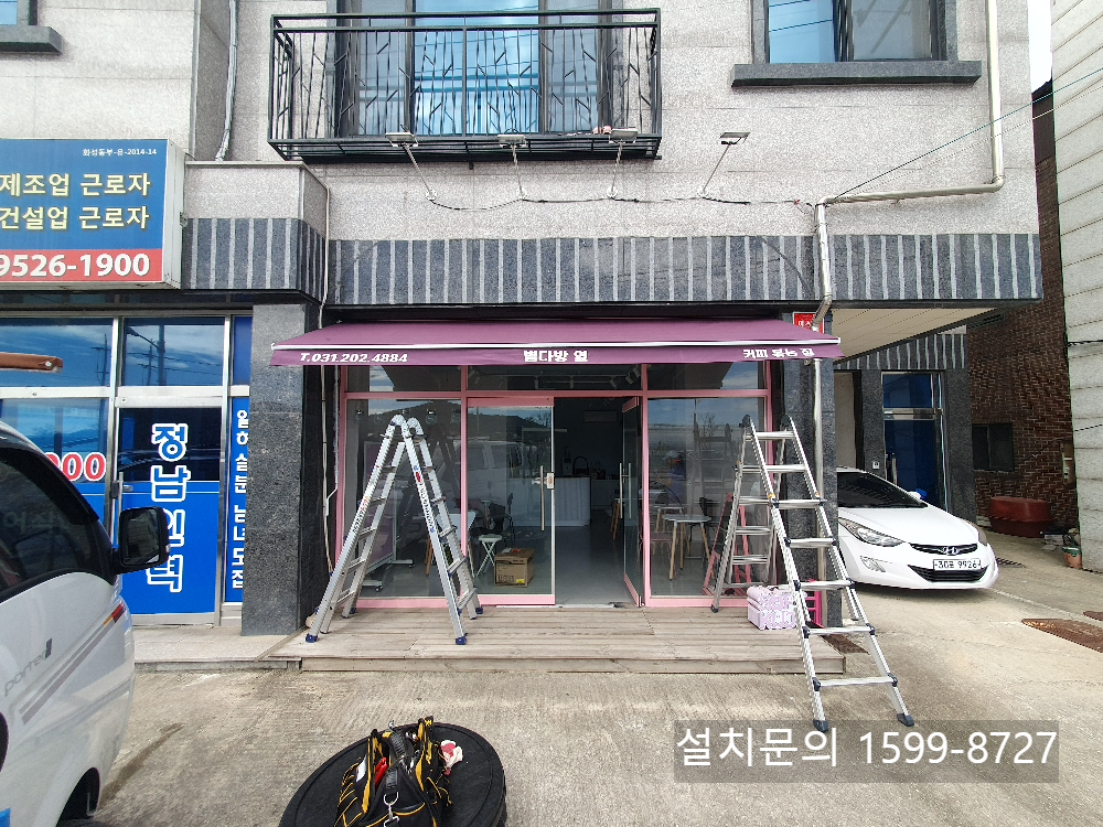 화성시 병점동의 새로 오픈하는 카페에서 라운드형 고정어닝을 철거한 후 수동접이식어닝을 설치해 드렸습니다.