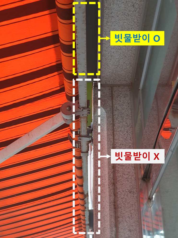 접이식어닝은 수년간 사용하여 원단이 노후되더라도 원단만 교체하여 사용이 가능합니다. 그러나 오늘 설치한 현장의 경우 기존에 접이식어닝을 설치할 때 어닝 위쪽으로 빗물이 흘러내리는 것을 막아줄 철판이 일부분에만 설치되어 있어 비가 내릴때마다 빗물이 어닝프레임 쪽으로 흘러내려 프레임에 부식이 심하게 발생한 상태입니다.