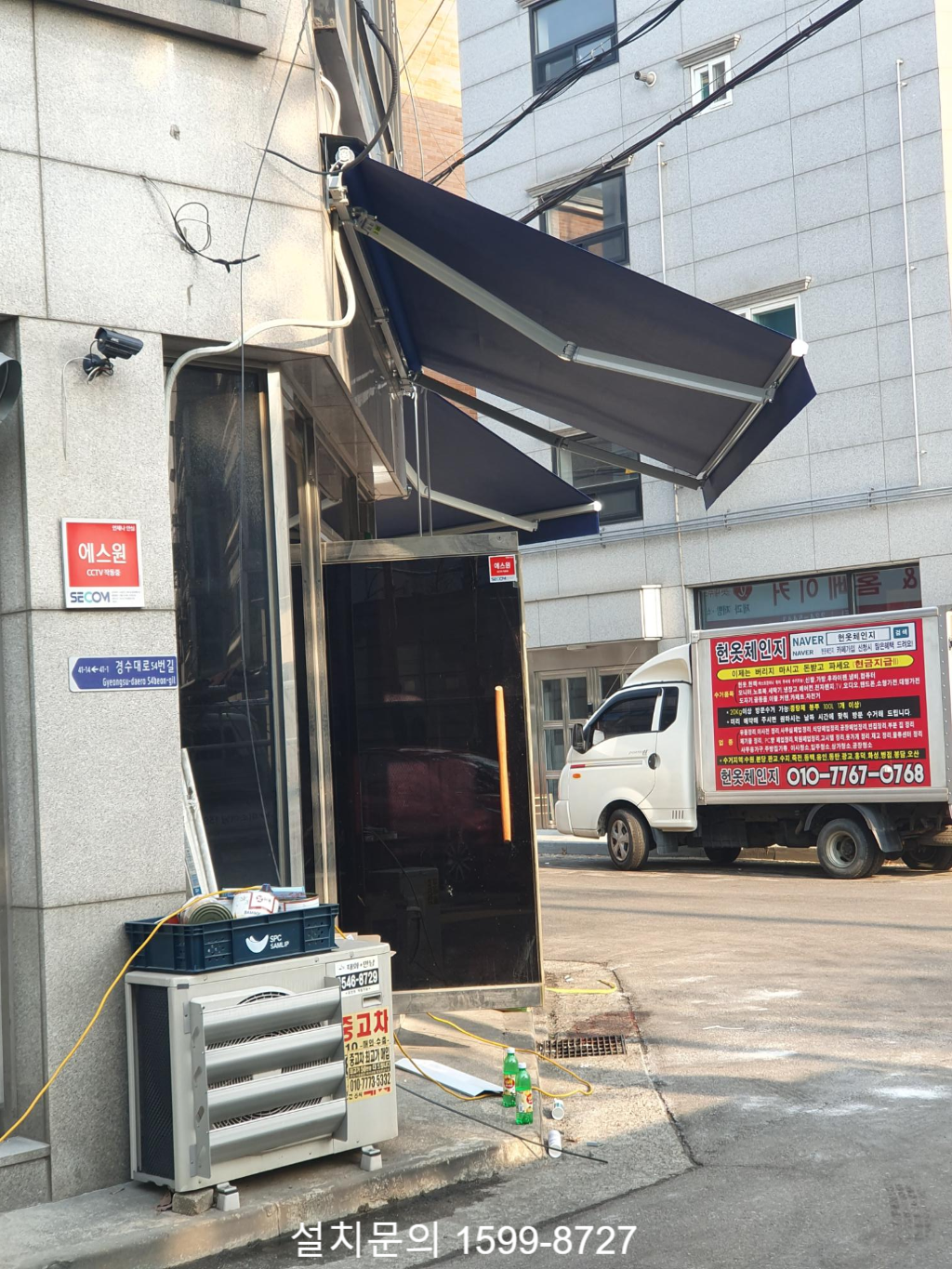 맨 오른쪽의 어닝을 먼저 설치했습니다. 1톤 탑차를 어닝 아래쪽에 주차해도 어닝과 간섭이 발생하지 않도록 여유있게 높이와 기울기를 조정해 드렸습니다. 상가에 발생하는 많은 어닝 파손 사고 중 한가지가 탑차입니다. 탑차를 운전하다 보면 시야가 많이 가려지기 때문에 좁은 길에서 어닝과 충돌하는 경우가 발생하는 것 같습니다.