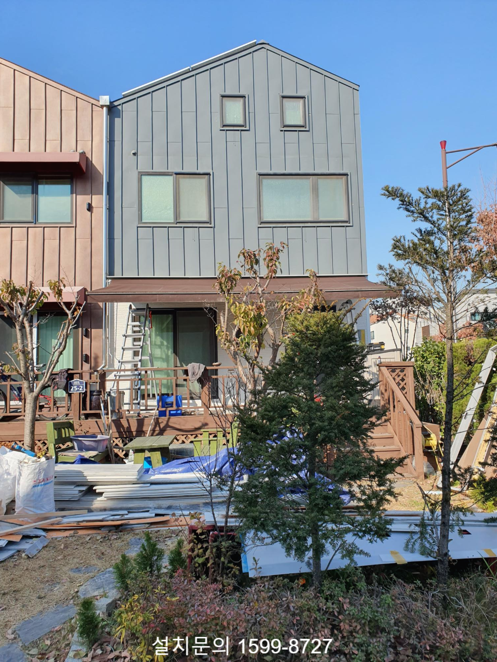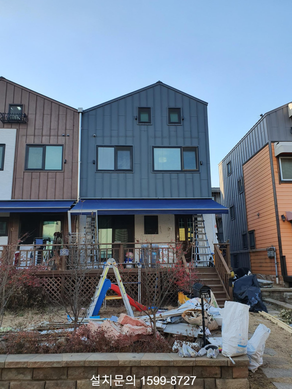 원래는 어닝이 없었는데 다른집에서 철거한 어닝을 가져다가 원단만 교체 한 후 재설치 했습니다. 마당에 깔려 있는 빨간색 원단을 떼어내고 회색(딕슨 3088번)원단으로 교체 했습니다. 목조주택으로 기존에 설치되어 있던 사각철판을 다시 시공한 후 어닝을 설치했습니다.