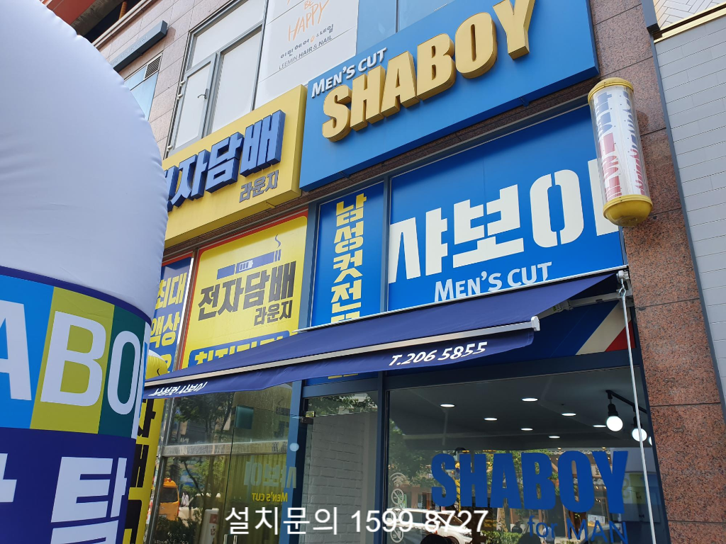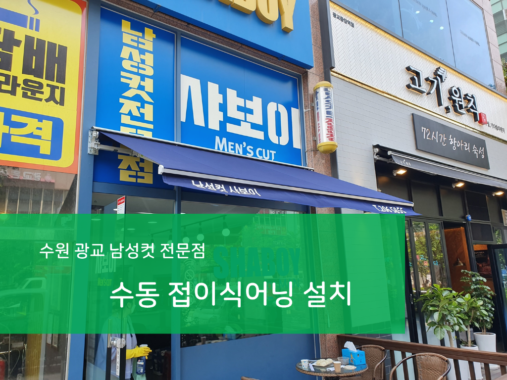 오늘은 경기도 수원시 광교신도시의 남성컷전문점 '샤보이'에 설치한 수동접이식어닝 시공사례를 소개해 드리겠습니다. 신규로 오픈하는 건 아니고 내외부 인테리어 공사를 새롭게 진행한 후 재오픈을 준비중이라고 하시네요.