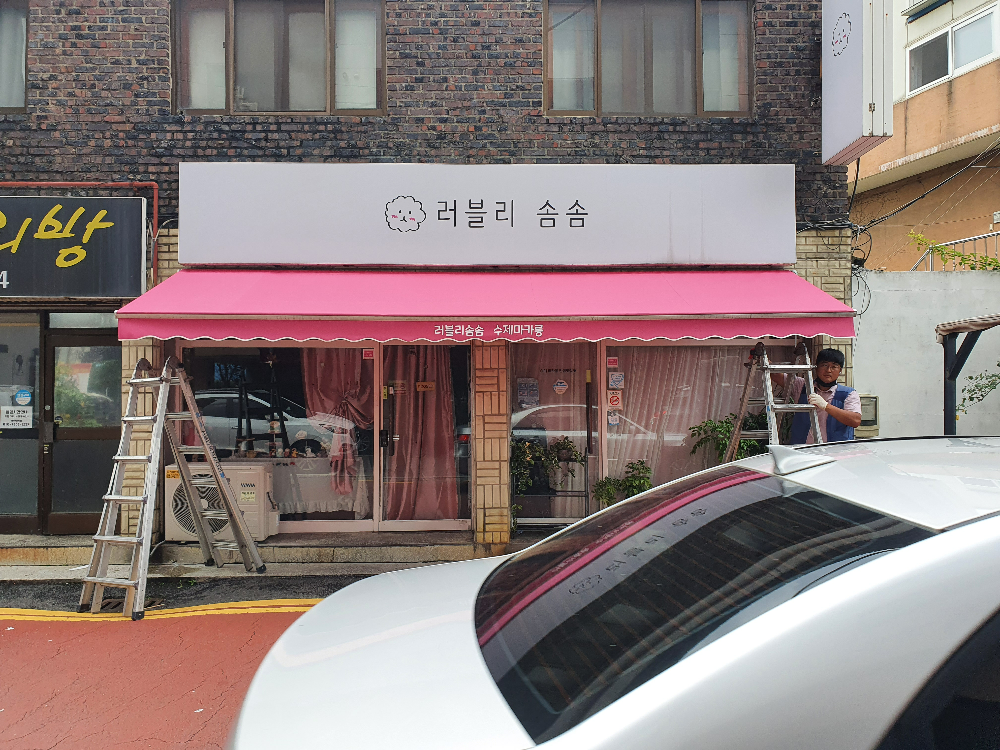 사진에 보이는 것처럼 기존 건물에 설치되어 있던 어닝을 그대로 사용하다 보니 원단이 낡고 가운데 부분에 인쇄되어 있는 지금 상호와는 다른 로고가 눈에 거슬립니다.