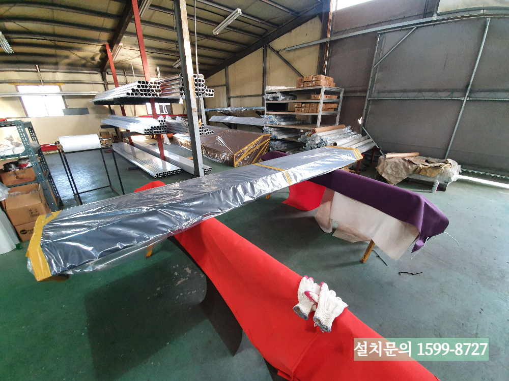 현장 실측 진행 후 1~2개월 정도 지난 다음에 다시 연락을 주셔서 제작을 요청하셨는데 현장 실측할 때 찍어 놓은 사진을 못 찾았습니다. 어닝 원단에 상호을 인쇄하여 원단가공을 완료한 후 미리 제작한 프레임에 원단을 입혀 완성된 고정식어닝을 현장으로 이동하기 위해 비닐로 포장한 상태입니다.