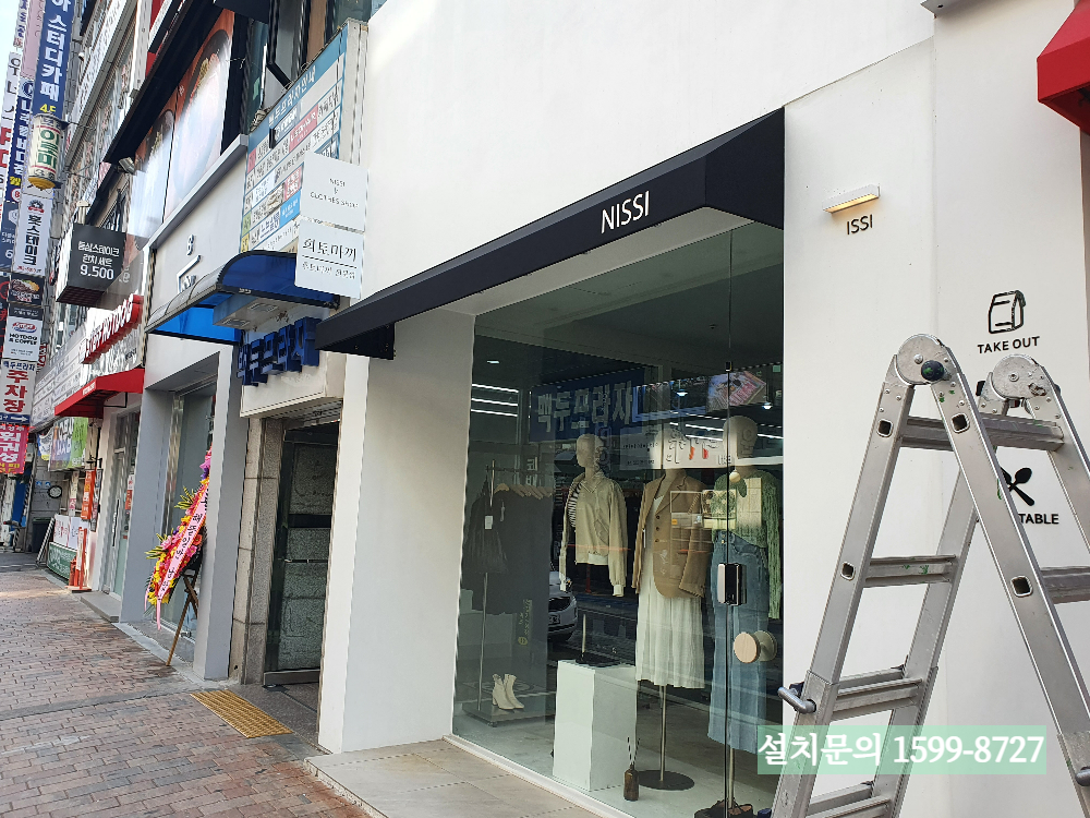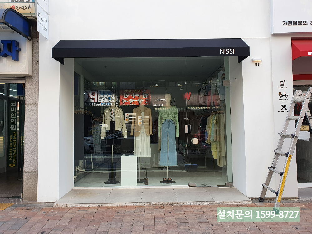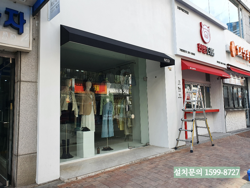 이상으로 경기도 안양시 범계동 상가 1층 의류매장 입구에 설치한 고정식어닝 시공사례 소개를 마치겠습니다.