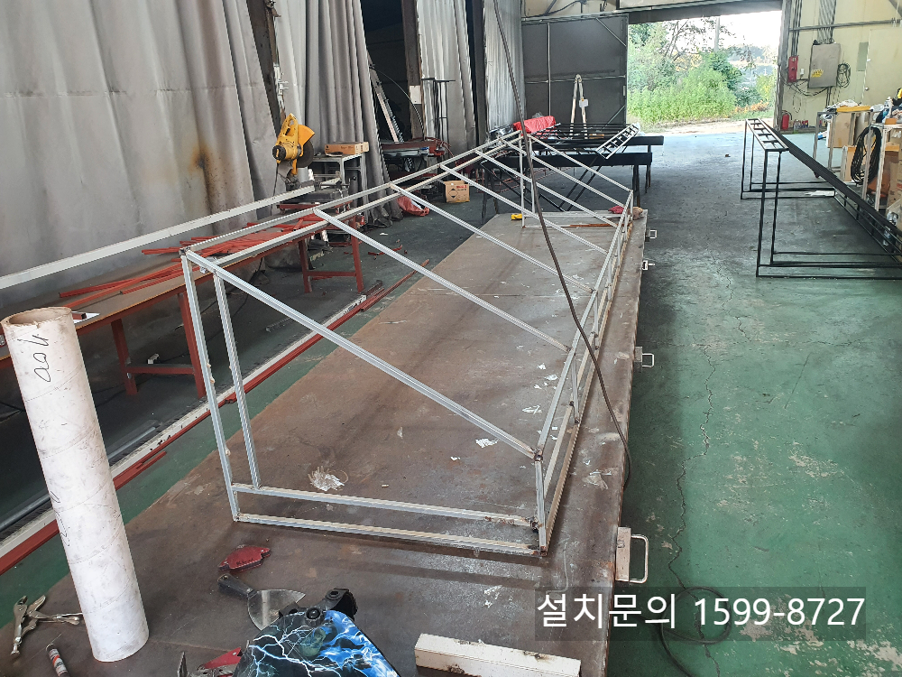 공장으로 고정어닝을 가져가서 멀쩡한 부분만 남기고 휘어진 부분은 교정을 위해서 절단해 놓은 상태입니다.