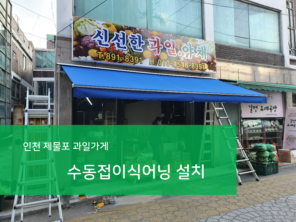오늘은 인천광역시 미추홀구 도화동(제물포역 인근)에 위치한 과일,야채 가게에 햇빛, 비가림용 차양목적으로 설치한 수동접이식 어닝 시공사례를 소개해 드리겠습니다.