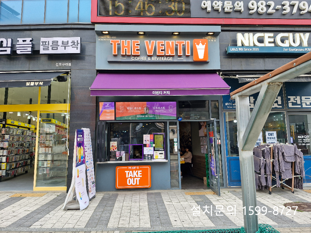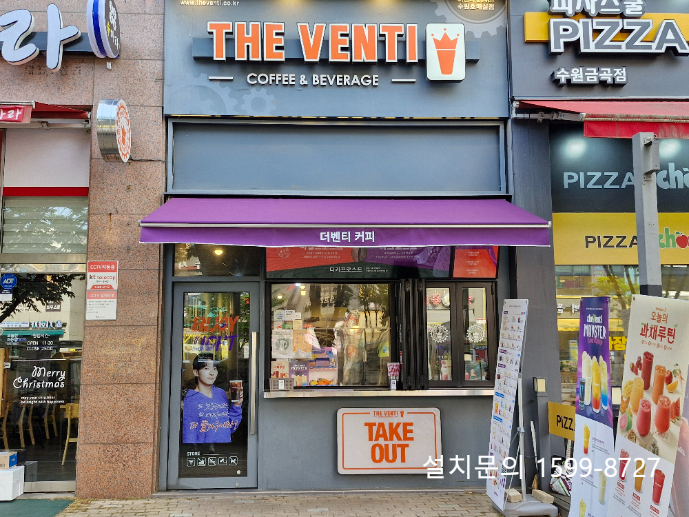 예전 더벤티커피의 접이식어닝 원단색상은 커피색을 연상시키는 진한 갈색이나 오렌지색이었는데 새롭게 바뀐 색상은 보라색입니다. 새롭게 바뀐 브랜드컬러에 맞춰서 어닝원단이 노후된 지점들은 원단을 교체하시는 것 같습니다.