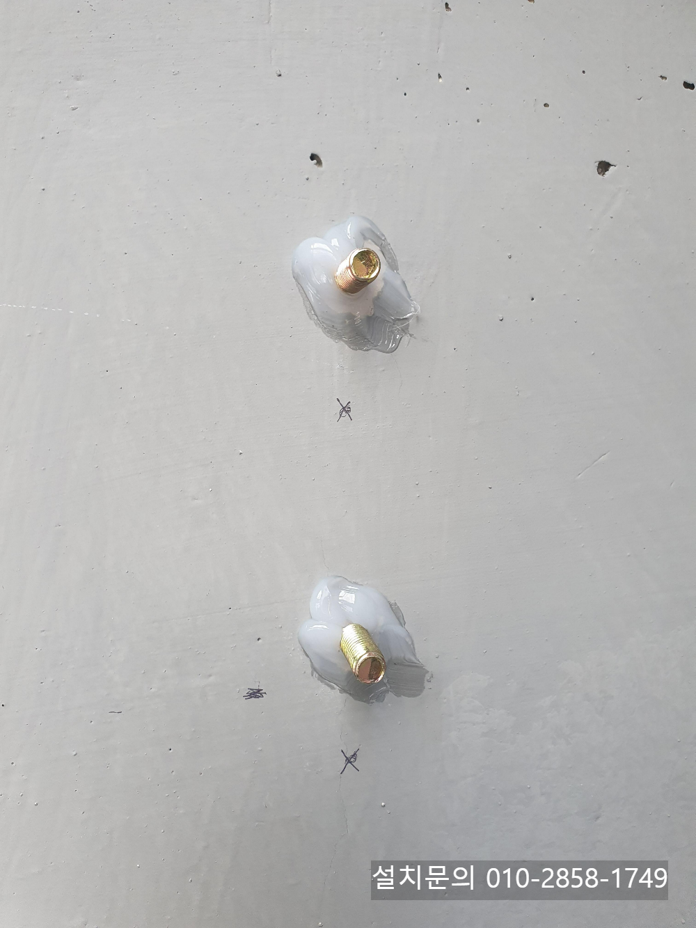 접이식어닝을 고정용 브라켓을 설치하기 위해 콘크리트 벽면을 타공해 앙카볼트를 고정한 후 빗물이 유입되지 않도록 실리콘을 도포해 줍니다.