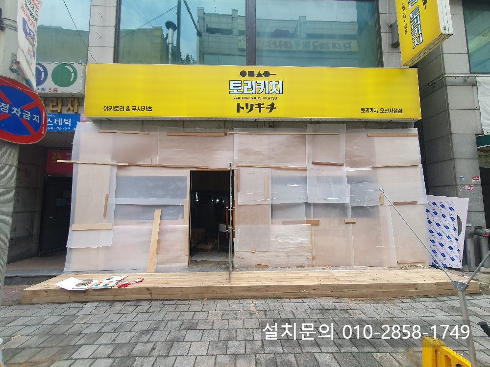 간판만 설치되어 있고 아직 외부 마감공사가 완료되지 않았지만 접이식어닝을 간판 바로 아래쪽에 설치할 예정입니다.