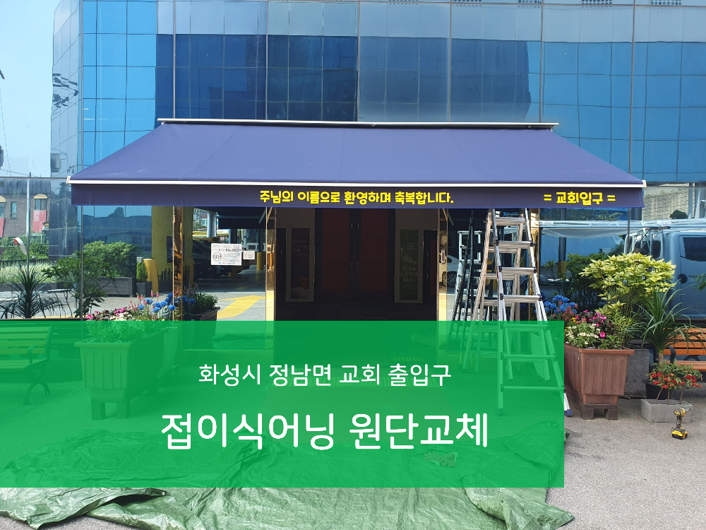 오늘은 경기도 화성시 정남면 교회 출입구에 설치되어 있던 접이식어닝 천갈이 작업내용을 소개해 드리겠습니다.
