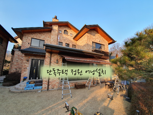 오른쪽에 있는 어닝은 기존과 같이 수동접이식으로 설치하였습니다. 거실쪽은 자주 사용하지만 오른쪽에 있는 작은 어닝은 자주 사용하지 않고 크기도 작아 수동으로 작동하여도 무리가 없기 때문에 전체 어닝설치비용을 줄이기 위해 수동접이식어닝으로 선택하셨습니다.