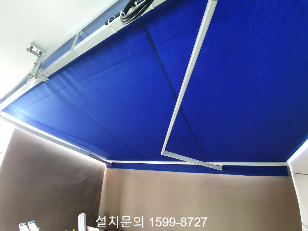 가로 4.2m, 돌출 3m에 프랑스 딕슨원단(3020번)을 사용해 제작한 자동접이식어닝 입니다. 천정형 브라켓을 사용하여 고정했으며 돌출 길이가 길기 때문에 양쪽 끝의 천정형브라켓 2개는 접이식어닝을 펼쳤을때의 무게에 의해 뒤로 밀리는 것을 방지하기 위해 브라켓 보강작업 후 설치했습니다.