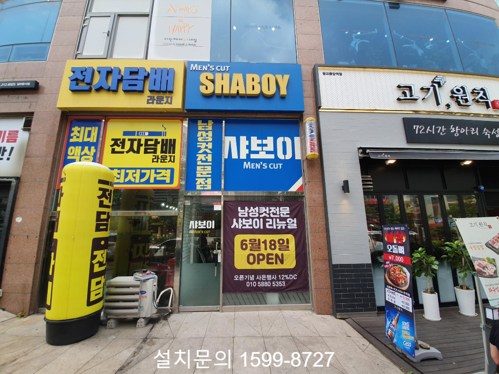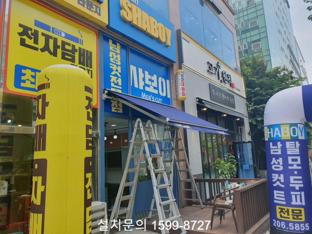 오늘은 경기도 수원시 광교신도시의 남성컷전문점 '샤보이'에 설치한 수동접이식어닝 시공사례를 소개해 드리겠습니다. 신규로 오픈하는 건 아니고 내외부 인테리어 공사를 새롭게 진행한 후 재오픈을 준비중이라고 하시네요.
