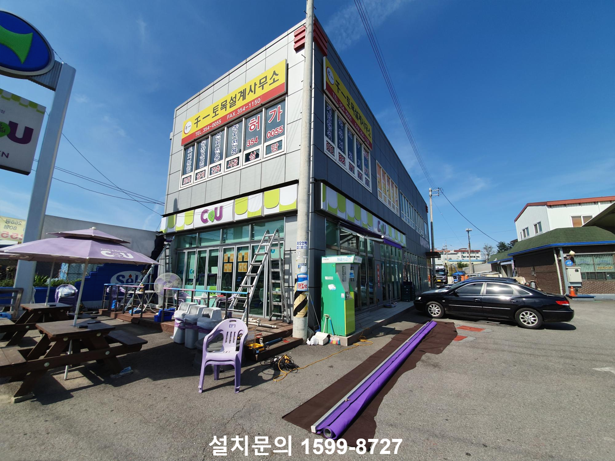 어닝을 설치해야할 편의점입니다. 편의점 측면에 있는 테라스에 자동접이식어닝을 설치할 예정입니다. 그런데 어닝을 새로 구입하는게 아니고 편의점 사장님의 지인분이 다른 건물에 사용하다가 철거해서 보관중인 어닝을 이동하여 재설치 해달라고 하시네요. 그리고 사진속 현금지급기가 보이는 편의점 정면 출입구에는 수동접이식어닝을 신규로 제작해서 설치할 예정입니다.