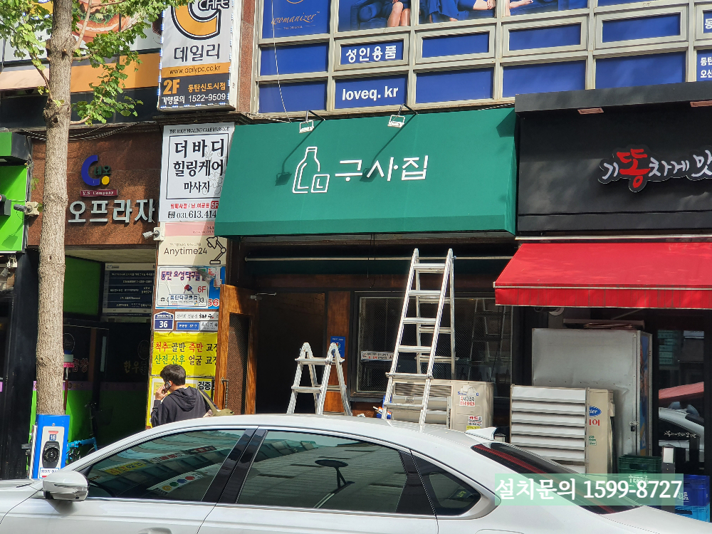 주로 저녁시간에 영업하는 가게의 특성상 주변이 어두울때에도 고정어닝을 환하게 밝혀줄 LED 투광등 2개를 고정어닝 위쪽에 설치했습니다.