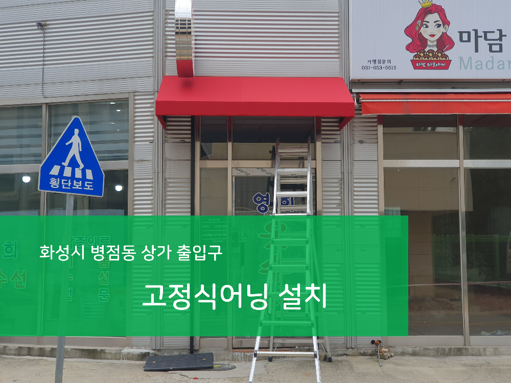 오늘 소개해 드릴 작업내용은 경기도 화성시 병점동 옷수선가게 출입구에 햇볕과 비를 막아줄 처마용도로 설치한 고정식어닝 시공사례입니다.